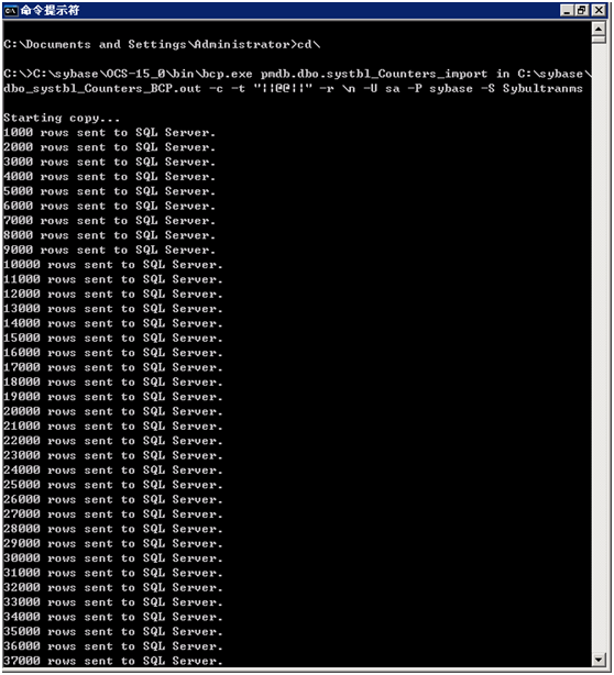 C:\sybase\OCS-15_0\bin\bcp.exe pmdb.dbo.systbl_Counters_import in C:\sybase\dbo_systbl_Counters_BCP.out -c -t "||@@||" -r \n -U sa -P sybase -S Sybultranms
