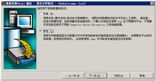 选择导出文件的格式:字符形式还是本地形式。选择字符形式。点下一步,